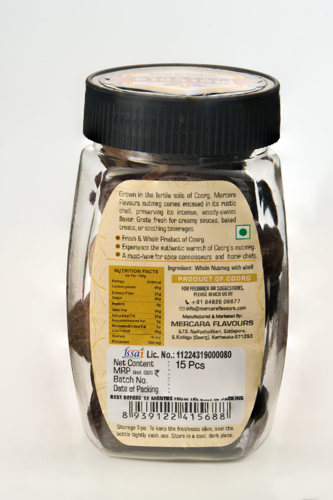 Mercara Flavours’ Nutmeg (With Shell) is carefully sourced from high-quality spice-growing regions and selected for its rich aroma and natural oils. Protected by its outer shell, the nutmeg retains its freshness, flavour, and potency for longer. Known for its warm, sweet, and slightly spicy taste, nutmeg has been used in traditional cooking and wellness practices for centuries. It enhances a wide range of dishes, from aromatic curries and biryanis to desserts, baked goods, and beverages. Mercara Flavours’ Nutmeg (With Shell) is ideal for those who value authentic flavour and long-lasting quality.